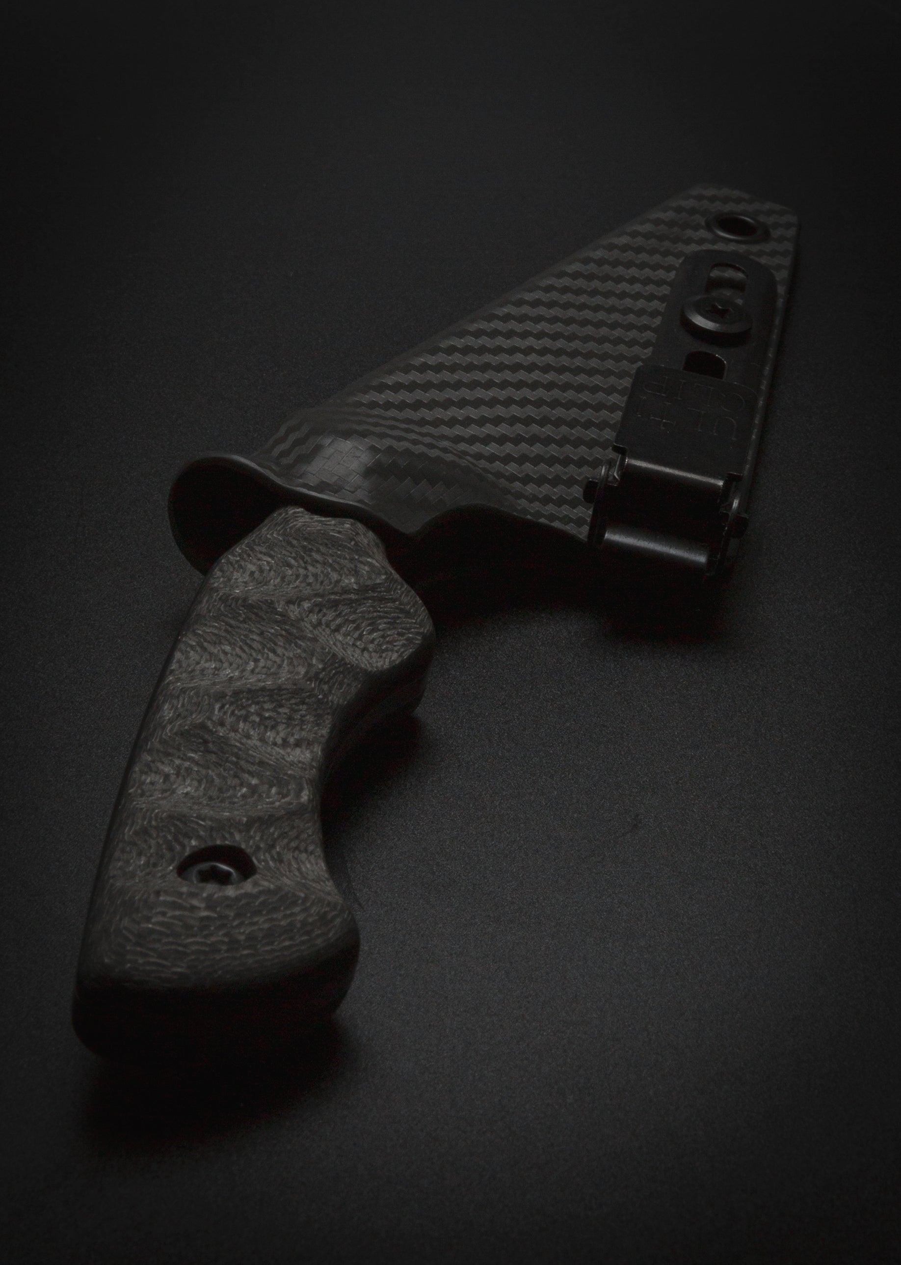Custom taco style Kydex carbon fibre storm grey sheath with Ulticlip attachment.